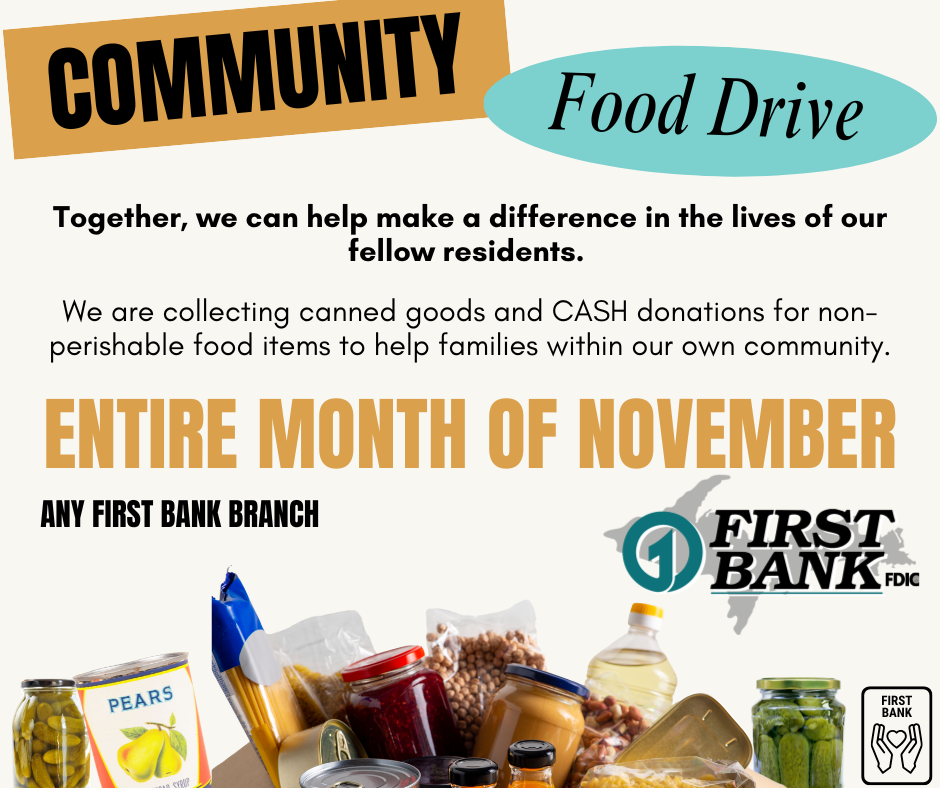 If you are a First Bank customer and cannot stop by, please call 1-877-848-5533 and ask for a Customer Service Representative for alternative donation options.